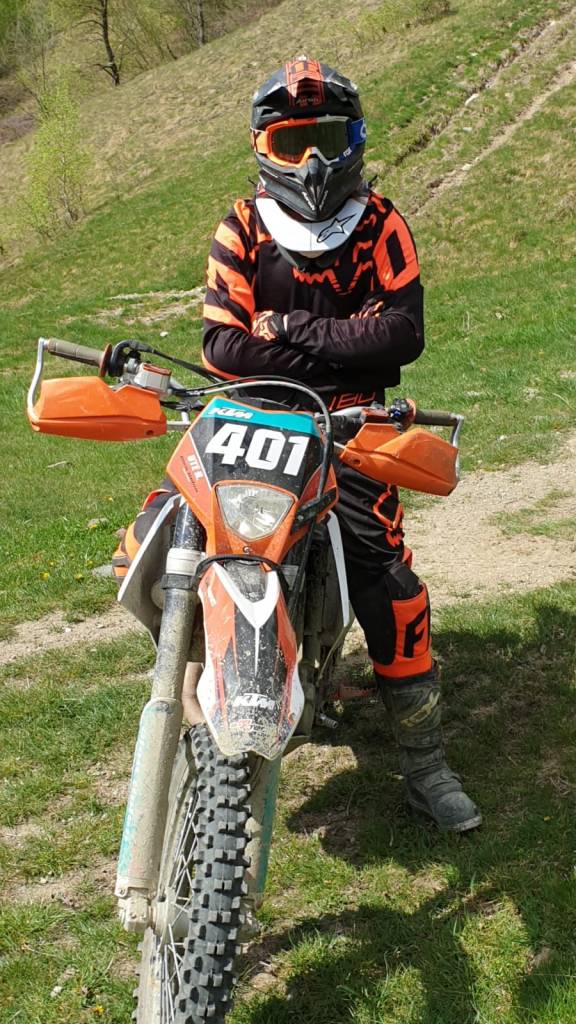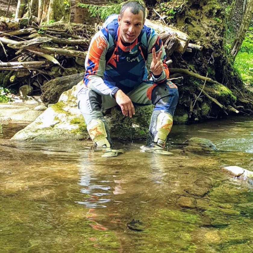 Wir finden recht schnell zu unserer Unterkunft und lernen Sasha, den Juniorchef kennen. Im Hof stehen bereits einige Enduromopeds und die dazugehörigen Transportmittel aus Deutschland, Tschechien und nun Österreich. An der Seite des Hofes ist ein Flugdach als Unterstand für die Bikes erbaut, ein Kärcher ist vorhanden, alles da, was man so braucht. Von der gemütlichen Terrasse führt eine Tür in das Haus. Diese ist übersät mit Aufklebern aus der Enduro- und MX Welt. Namhaft Hersteller von Bikes und Equipment, sowie Startnummern und Guideplates von einigen großen Enduroveranstaltungen (Erzberg, 111Megawatt, …) sind hier verewigt. Ein Hinweisschild “NO Enduroequipment inside” macht klar, wo wir uns umziehen werden. Ist aber verständlich, das man nicht mit den möglicherweise gut genutzten Stiefeln etc. ins Haus soll. Wir beziehen ein schlichtes, aber sehr gemütliches Zimmer, das alles hat, was man so braucht. Der kleine, 25cm Röhrenfernseher sieht entzückend aus, ob er funktioniert, wissen wir allerdings bis heute nicht.