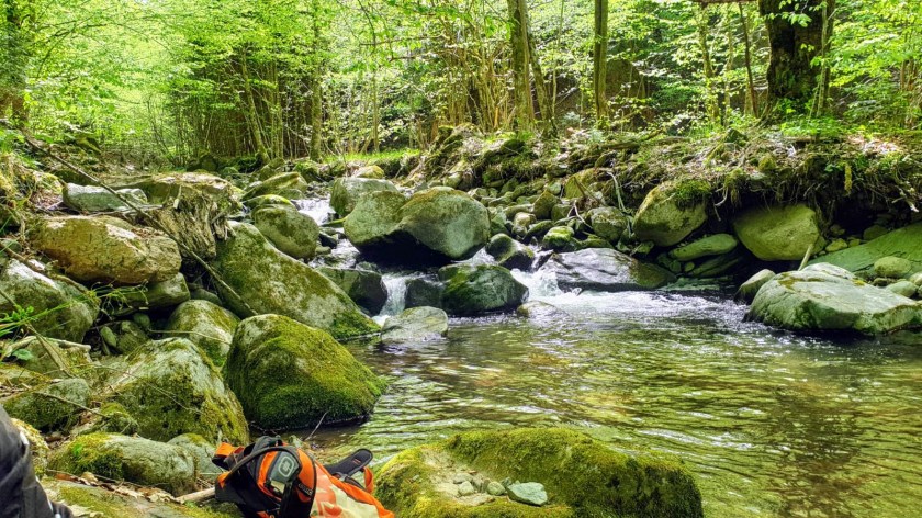 Für den letzten Fahrtag nehmen wir uns eine etwas kürzere Route aus Sasha’s Repertoire vor, da wir nach dem Heimkommen ja noch packen, Mopaln versorgen usw. müssen. Mit Euphorie, gepaart mit etwas Wehmut wegen dem letzten Tag, starten wir mit einer kurzen Strecke auf der Straße den See entlang. Nach kurzer Fahrt biegen wir in eine entspannte Forststraße, die wir schon vom 2. Tag her kennen. Es dauert nicht lang, bis die Route – und ja, mittlerweile pass ich mehr aufs Navi auf – die Forststraße verläßt und wir uns in einem “Bachbett” wiederfinden. Das ist eigentlich ein Weg, jedoch haben Regen- und Schmelzwasser diesen in einen kleinen Bach verwandelt. Es dauert nicht lang, dass Ute sich zur Erfrischung niederlegt. Da dieser Rückschlag ein wenig an der Motivation nagt, besprechen wir kurz das weitere Vorgehen, entscheiden uns aber dann doch für die Weiterfahrt. Ein wenig später hört der Bach auf, und der Weg präsentiert sich in seiner vollen Pracht, die Steigung nimmt zu, die Steine werden größer und somit wir das Vorankommen immer interessanter. Ich habe von Anfang an Probleme mit meiner Kupplungshand (sie will heute nicht so wie ich), somit bleibt mir nichts anderes übrig, als eine Pause einzulegen. Ute nützt die Gelegenheit und zieht unaufhaltsam an mir vorbei, also ob sie nie was anderes gemacht hätte. Mich beschleicht das Gefühl, ich habe meiner Frau zu viel gezeigt 🙂 Nein, ich bin wirklich stolz, wie sie das gemacht hat. Nach der Erholung, reiße ich mich auch wieder zusammen und folge Ute nach oben.